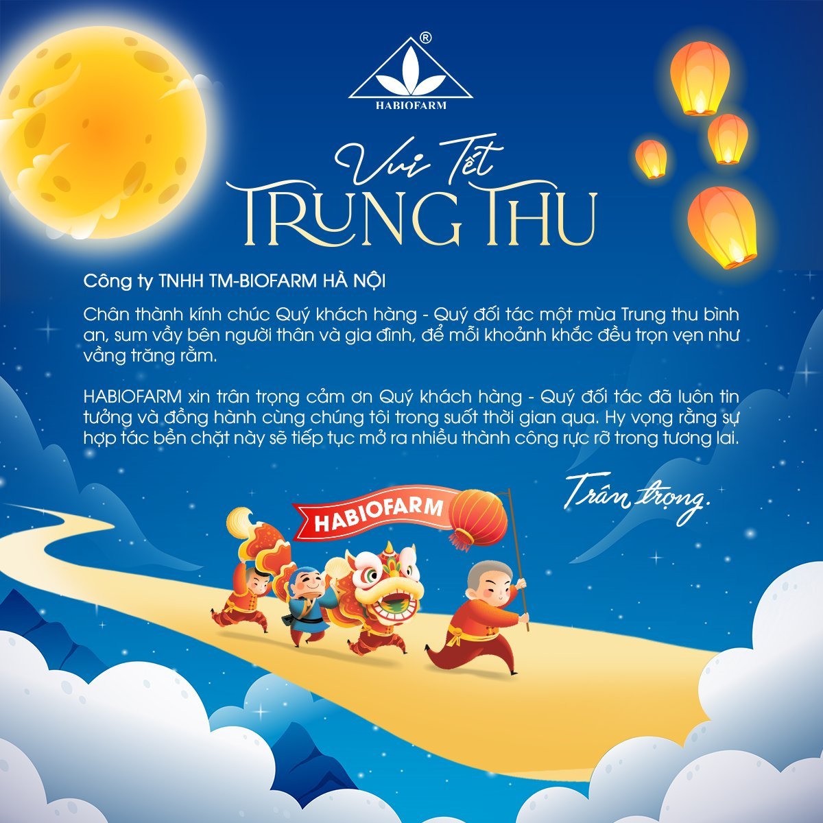 Nhân dịp Tết Trung Thu, HABIOFARM xin gửi lời tri ân sâu sắc tới Quý khách hàng, Quý đối tác cùng toàn thể cán bộ công nhân viên và gia đình một mùa Trăng thật an lành, đầm ấm, tròn đầy yêu thương và thành công viên mãn!